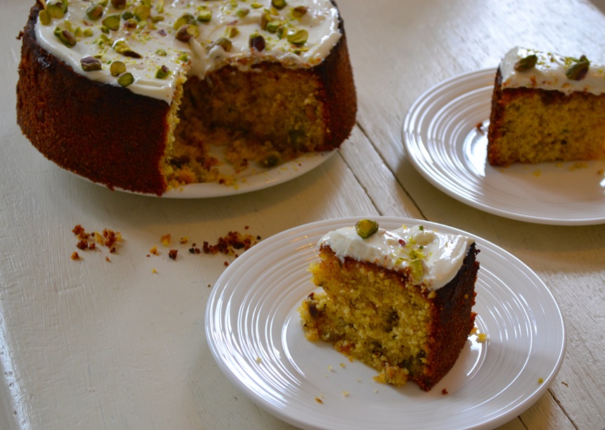 A 2 tojássárgáját a cukorral fehéredésig keverjük, hozzáadjuk az olajat, jól elkeverjük majd a vizet, és szép lassan hozzászórjuk a sütőporral és pisztáciával, keményítővel elkevert lisztet. A kemény habbá vert tojásfehérjék felét hozzákeverjük először lazán a tésztához, majd a másik felét is, de óvatosan minél kevésbé törjön össze a hab. A tortaformának csak az alját kenjük ki vékonyan olajjal és szórjuk meg vékonyan liszttel. (A fölösleget ütögessük ki) 160-165 fokon 30 percig süssük. Miután kivettük a sütőből (a széle hozzá kell, hogy süljön a formához) 3 pohárból állványt készítve (a tortaforma szélét kell megtartaniuk), a tortát fejjel lefelé ráillesztve hagyjuk hűlni. Ha teljesen kihűlt késsel körbevágjuk, hogy elválasszuk a tortaformától és jó éles késsel szeleteljük. Végül a porcukrot jól felhabosítjuk a citromlével, majd megkenjük a kihűlt torta tetejét, megszórjuk a darabolt pisztáciával, és szeletelve tálaljuk.