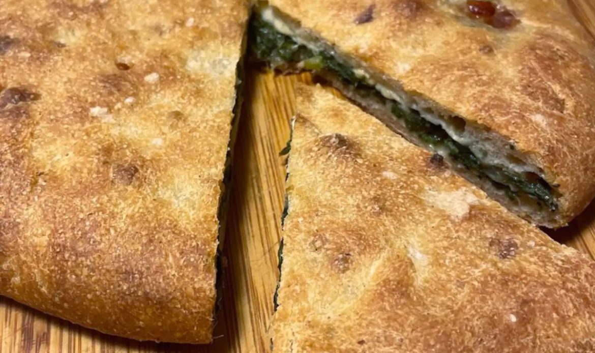 A tésztához a lisztet, az élesztőt, a sót és a cukrot összekeverjük, majd langyos vízzel és az olajjal összegyúrjuk. Addig dagasztjuk, amíg egy rugalmas, sima tésztát kapunk. Egy órán át, meleg helyen, letakarava pihentetjük. Közben elkészítjük a tölteléket. A spenótot felfuttatjuk kevés olajon egy serpenyőben, a zúzott fokhagymával, addig, amíg összeesik. Hagyjuk teljesen kihűlni, majd nyomjuk belőle ki a vizet. Keverjük össze a ricottát, a mozzarellát, a parmezánt, a fűszereket a kinyomkodott, felvágott spenóttal. A megkelt tésztát felezzük el, nyújtsuk két körlappá. Az egyikre halmozzuk rá a tölteléket, majd tegyük rá a már kinyújtott másik tésztát. Nyomkodjuk össze a széleket, majd kenjünk le a tojással, szurkáljuk meg a tetejét villával. A 220 Celsius fokra előmelegített sütőbe toljuk, és 20-25 perc alatt készre sütjük.