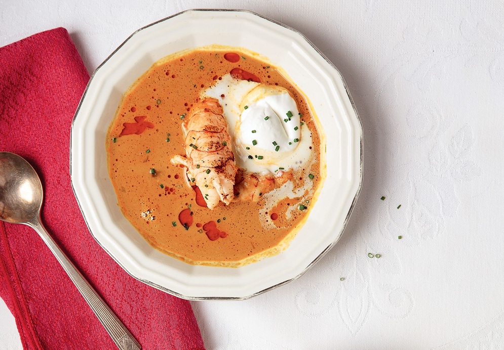 A garnélákat jól megmossuk, megpucoljuk, a farkait félretesszük. A többi részét a zeller zöldjével és a paradicsomokkal kb. fél órát főzzük, majd összeturmixoljuk, és leszűrjük nagyon kis lyukú szűrőn. A levét félretesszük. 1-2 kanál olívaolajon megpároljuk a csíkokra vágott zöldséget és gyömbért. Ha megpuhult, beleteszünk 1-2 karika citromot, felöntjük a félretett leszűrt lével, és beletesszük a rákfarkakat. Pár percig főzzük, majd a rákfarkakat kivesszük, és félretesszük tálalásig. Összeforraljuk a tejszínnel, a citrommal, és sóval, borssal ízesítjük. Tálaláskor megszórjuk friss petrezselyemmel, és a tányérokba elosztott garnélafarkakra merjük a levest.